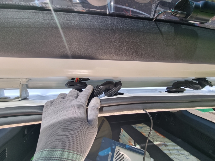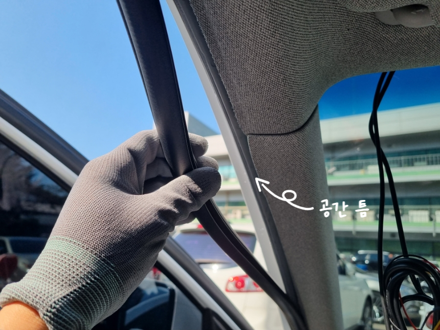 뒷문을 열고 D필러에서 넘어온 케이블을 고무몰딩 속